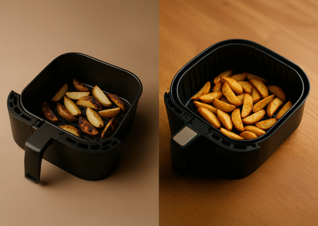 O que atrapalha o resultado Excesso de umidade na superfície; cortes muito irregulares; cesta lotada que bloqueia a circulação de ar; sal ou marinadas líquidas aplicados antes de secar; empanagem mal aderida; começar em temperatura alta e criar casca dura com miolo cru; não preaquecer; virar pouco; peças encostando nas laterais da cesta.