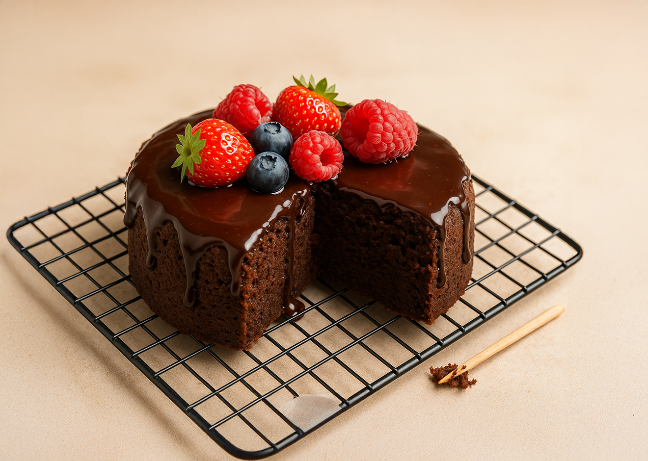 Dicas do Chef Use forma pequena e alta para câmara de calor mais estável; pese os ingredientes para consistência; se a massa ficar muito densa, ajuste com 1–2 colheres de sopa de leite; para topo lisinho, cubra a forma com papel-alumínio nos primeiros 15 minutos sem encostar na massa; finalize com calda simples de chocolate aquecida após desenformar para selar a umidade.