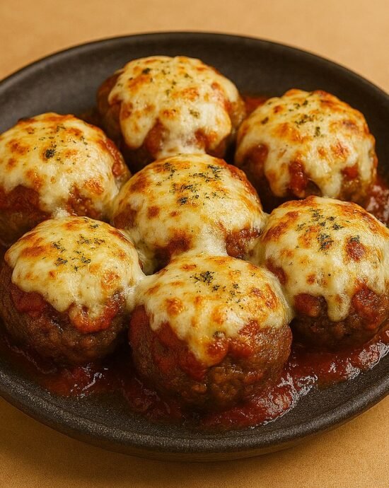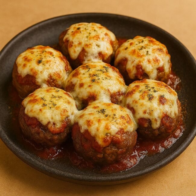 O molho de tomate e o queijo gratinado por cima transformam os bolinhos em uma versão prática do clássico parmegiana, sem necessidade de fritura ou forno convencional.
